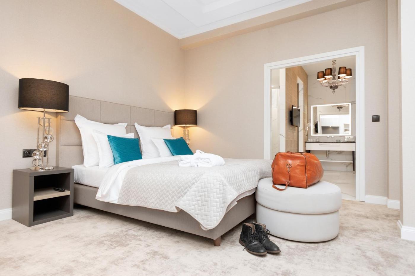 Apartament Królewski. Ten przestronny apartament mieści salon, oddzielną sypialnię oraz łazienkę z wanną i bezpłatnym zestawem kosmetyków. Apartament ma dźwiękoszczelne ściany. Wyposażenie obejmuje klimatyzację, minibar, telewizor z płaskim ekranem i dostępem do kanałów kablowych oraz zestaw do parzenia kawy i herbaty. Z okien roztacza się widok na miasto. W tej opcji zakwaterowania zapewniono 2 łóżka. Apartament - 4 osobowy. Powierzchnia pokoju ok.: 70 mkw.